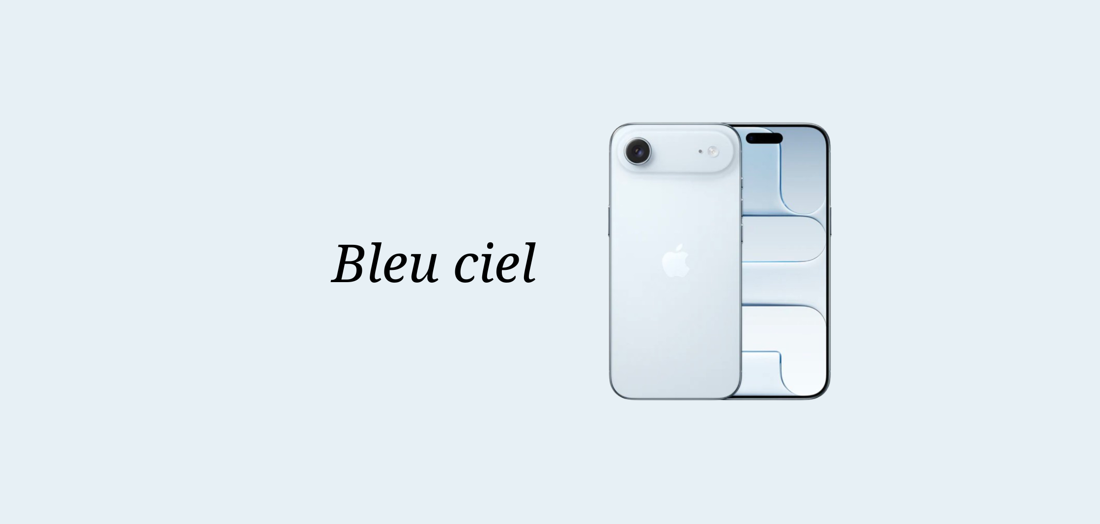 A produit innovant, couleur innovante : le Sky Blue de l'iPhone 17 Air est le bleu le plus clair jamais proposé sur un iPhone. Contrairement aux teintes de bleu précédents qui étaient soit très foncées (iPhone 12/13) soit trop ternes (iPhone 15), cette couleur évoque parfaitement la légèreté et la finesse de l'iPhone Air.